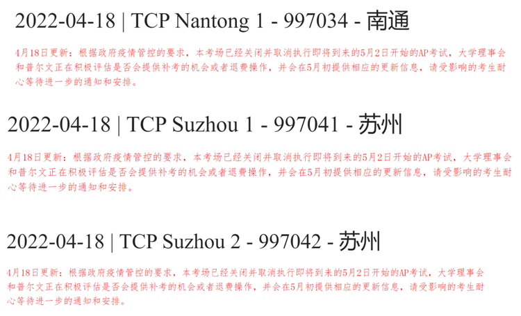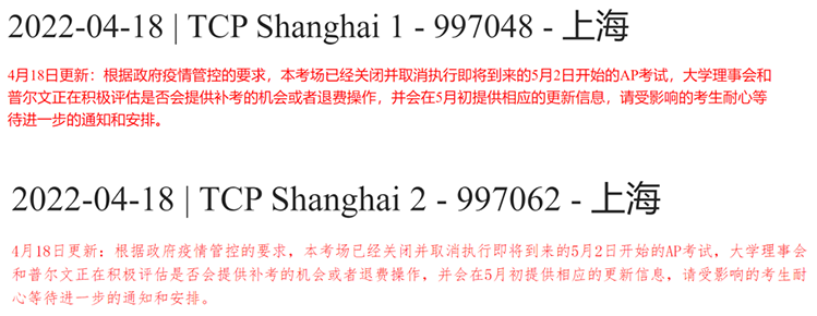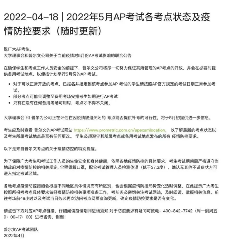 沪上学校相关学校接到通知,因为防疫要求,于5月2日开始的AP考试考场取消执行,大学理事会和普尔文正在积极评估是否会提供补考机会和研究退费事宜,并在5月初公布相关信息,请广大考生耐心等待。