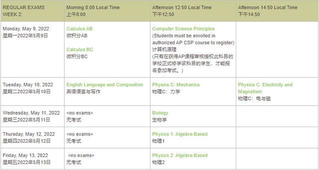 2022年AP考试将在5月2日-6日和5月9日-13日两周内以线下考试形式进行。2022年AP考试不提供网上考试选择。