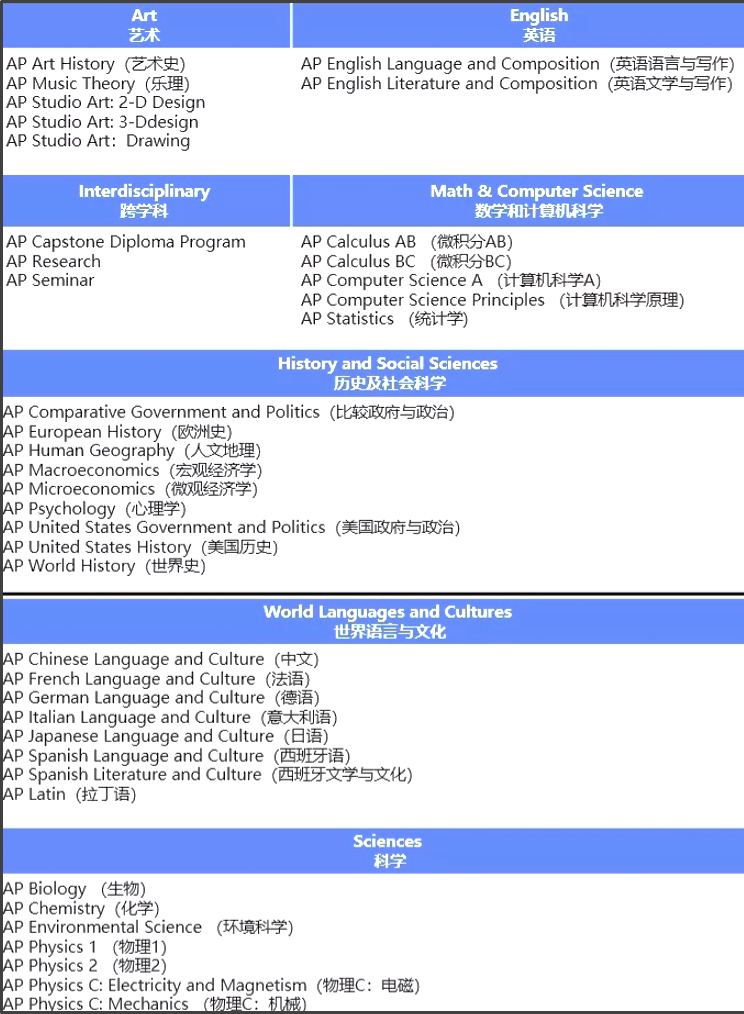 AP课程包括艺术、科学、数学和计算机、历史和社会科学、英语和世界语言等7大类总共38门课程,每个学校自主决定所提供的AP课程。学生需要合理选择适合自己能力及兴趣的学科及考试科目。