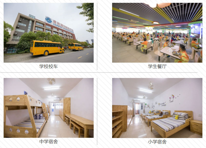 学校餐厅配备专业的营养师、中西餐厨师。学校共有四栋学生宿舍,每间宿舍均配备淋浴间。另有生活指导老师监督学生内务,管理宿舍、餐厅纪律等。