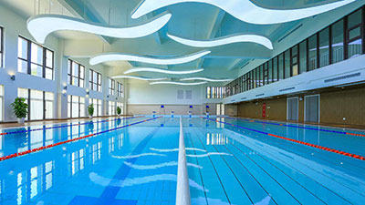 运动设施:室内体育馆、篮球馆、羽毛球场、足球场、四季恒温室内游泳池