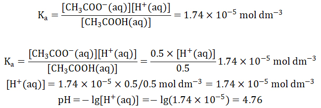 在此时的混合溶液中,[CH3COOH]=0.5 mol dm-3,[CH3COO-]=[Na+]0.5 mol dm-3。
