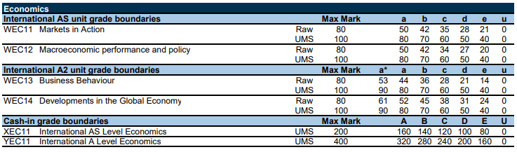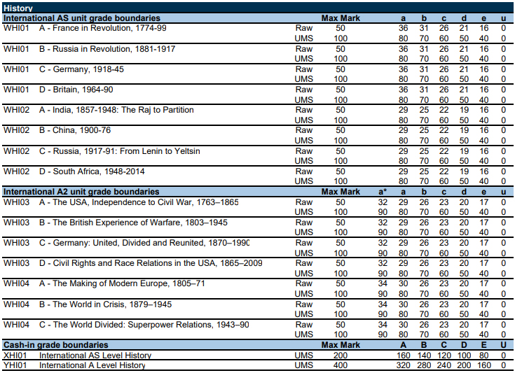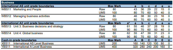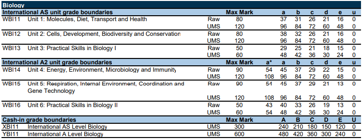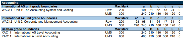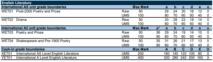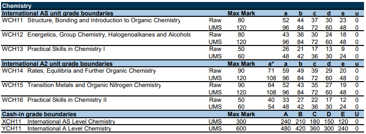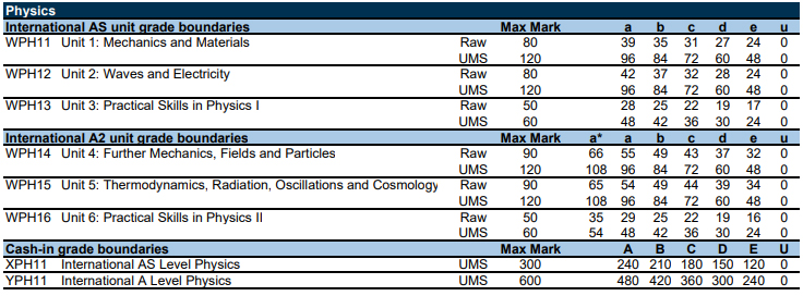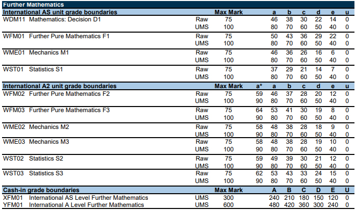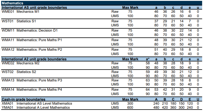 以下为爱德思考试局,数学、进阶数学、物理、化学等10门科目的分数线。表格中的Raw marks(卷面分)可以转换成 UMS marks(统一标准分数)。90%对应A*,80%对应A,以此类推,40%对应及格成绩E。
