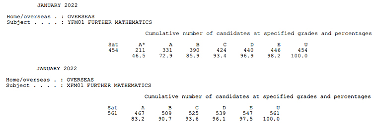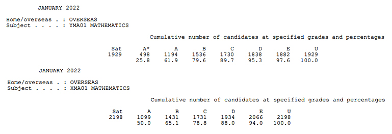 今年1月份A-Level成绩的高分率较去年秋季大考高一些,比如1月数学的A*率为25.8%,而21年秋季大考数学的A*率仅有14.2%。