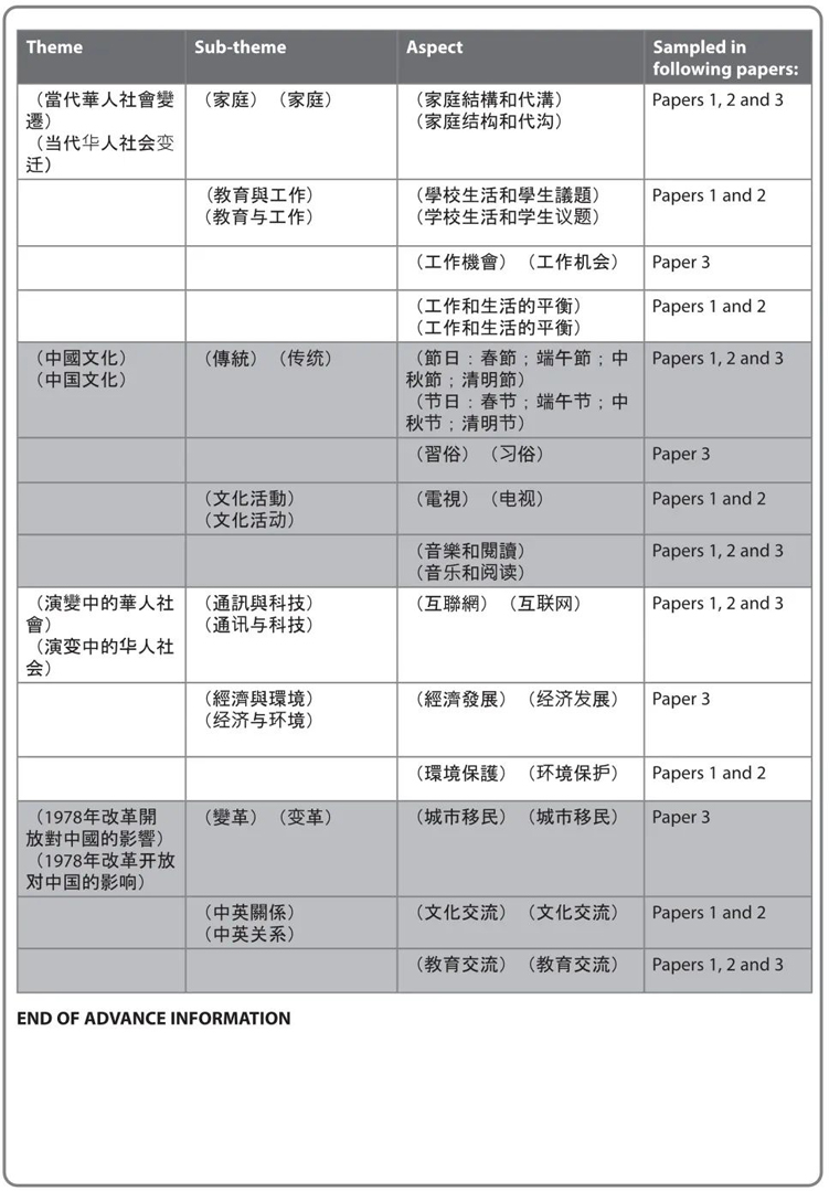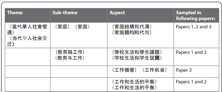 sampled in the following papers,即某个theme/sub-theme/aspects相关的考试内容将出现在所罗列的试卷中,比如下图中文预先信息里Aspect的“学校生活和学生议题”将出现在Paper 1和Paper 2试卷中。