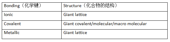 化学键包含了离子键(Ionic bonding),共价键(covalent bonding)和金属键(metallic bonding)。同时,因为键的种类不同会导致化合物的结构不同,因此它们表现出的物理性质也相对应的不同。