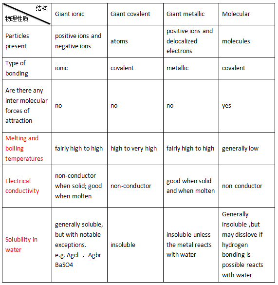 物质的可溶性实质上取决于是否会被电解,这一点在U2中我们会具体进一步学习。这里只需要记住巨型共价结构(Giant covalent)完全不溶于水。巨型金属结构(Giant metallic)和分子结构(Molecular )不溶于水,除非和水发生反应才会溶于水。巨型离子结构(Giant ionic)溶于水,但是个别情况不溶于水,e.g. Agcl,AgbrBaSO4。