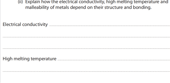物质的导电性通常是由游离电子(Delocalized electrons)所影响的。如果电离子可以自由移动那么通常意义下它具有导电性。分子(Molecular)和 巨型共价结构(Giant covalent)由于只是共享电子,不产生电离子,所以他们是绝缘体(Non-conductor)。巨型离子结构(Giant ionic)本身存在电离子,但是固体情况下无法自由移动,融化以后电离子即可自由移动。所以它是固体不导电,融化后导电(Non-conductor when solid; good when molten)。巨型金属结构(Giant metallic)本身就具有游离电子(Delocalized electrons),所以金属导电性在固体和融化状态下都很好(good when solid and when molten)。