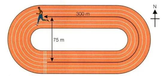 如图所示,该运动员的实际运动距离distance=300m。他的位移displacement在north方向为75m。假设该运动员所花时间为50s。