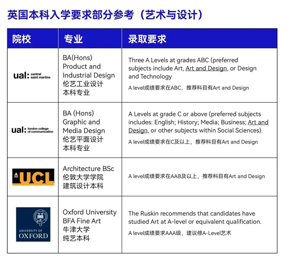 在申请海外艺术院校过程中,大部分知名院校都会要求学生需提供A-Level艺术与设计相关科目成绩: 以英国知名艺术院校伦敦艺术学院(UAL)与综合类大学伦敦大学学院(UCL)艺术专业为例,都在录取要求中对A-Level成绩有着明确的要求。