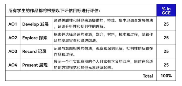 A-Level艺术与设计课程由个人调查研究(占比60%)+限时命题测试(占比40%)两部分组成。