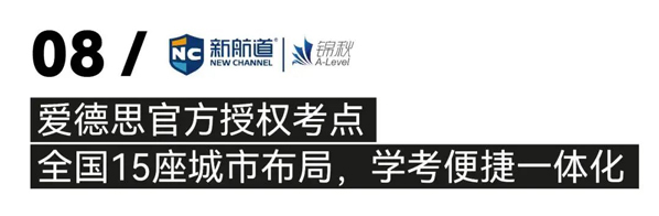 新航道锦秋&AF国际艺术中心在全国15座城市拥有A-Level官方授权考点,是全国最大的爱德思考试局官方授权考试机构。培生爱德思是英国最大的学术及职业考试认证机构,为超过80个国家和地区的170多万人提供国际考试认证服务。