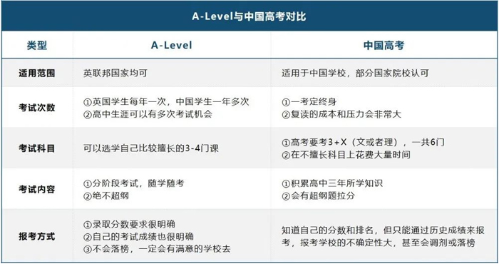 A-Level被称为洋高考,与中国国内高考有着千丝万缕的联系,从适用范围、考试次数、考试科目、考试内容、报考方式等几个方面进行对比,可以得出下图:
