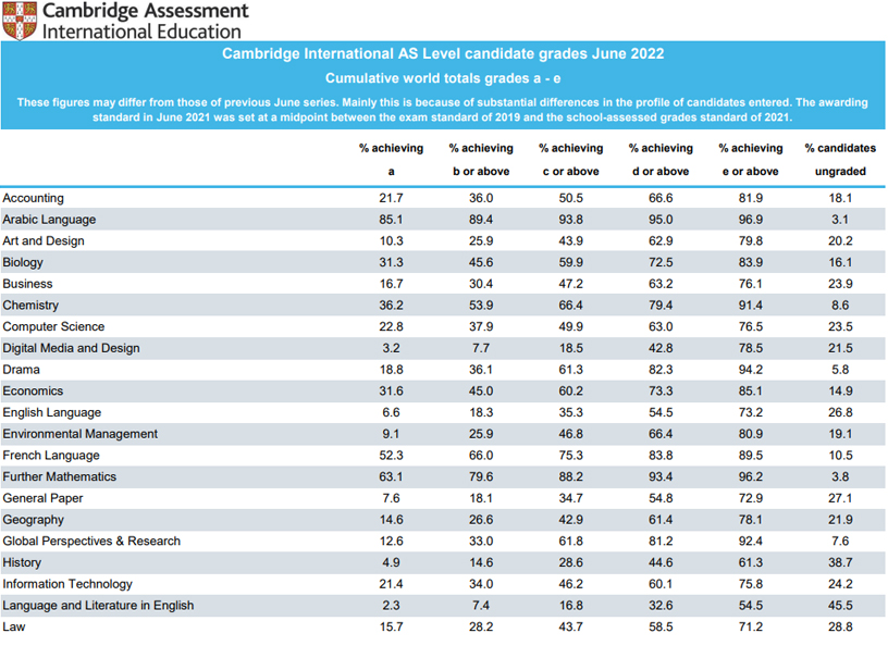 AS阶段,a率最高的科目是阿拉伯语(85.1%),进阶数学(63.1%)紧随其后,而a率最低的科目则是英语语言与文学,仅有2.3%。