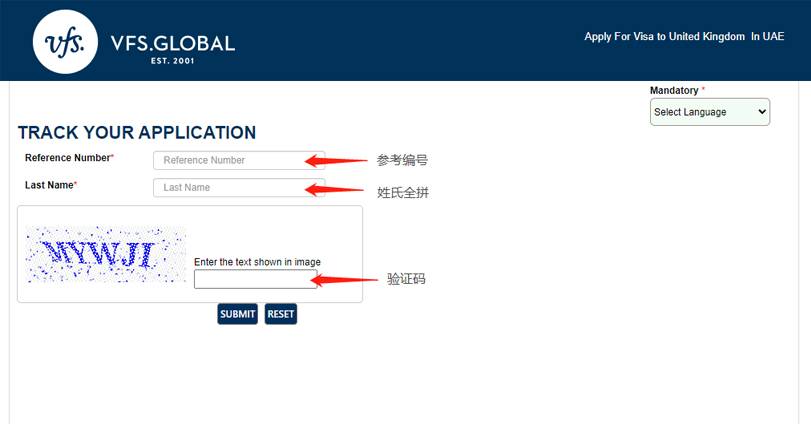 ② 或者,直接输入网址https://visa.vfsglobal.com/chn/zh/gbr/track-application进入“申请进度查询”页面。