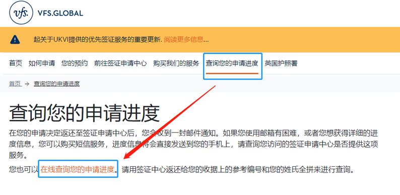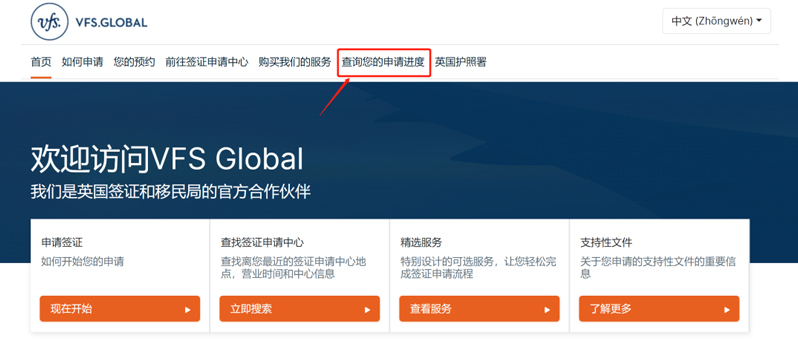 ① 签证申请人进入威孚VFS Global英国签证中心官网网站https://visa.vfsglobal.com/chn/zh/gbr/,点击上方导航栏“查询您的申请进度”