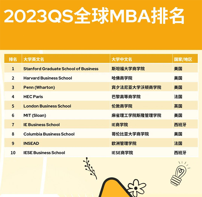 斯坦福大学商学院连续第三年蝉联全球全日制MBA 课程排行榜的首位,哈佛商学院稳居第二,而沃顿商学院则位列至第三。