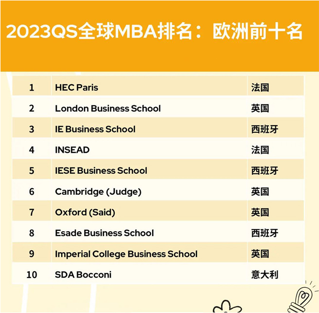巴黎高等商学院(HEC Paris)提供了欧洲最好的MBA课程,总排名第4,今年西班牙IE商学院(总排名第7)和IESE商学院(总排名第10)更是跻身前十。