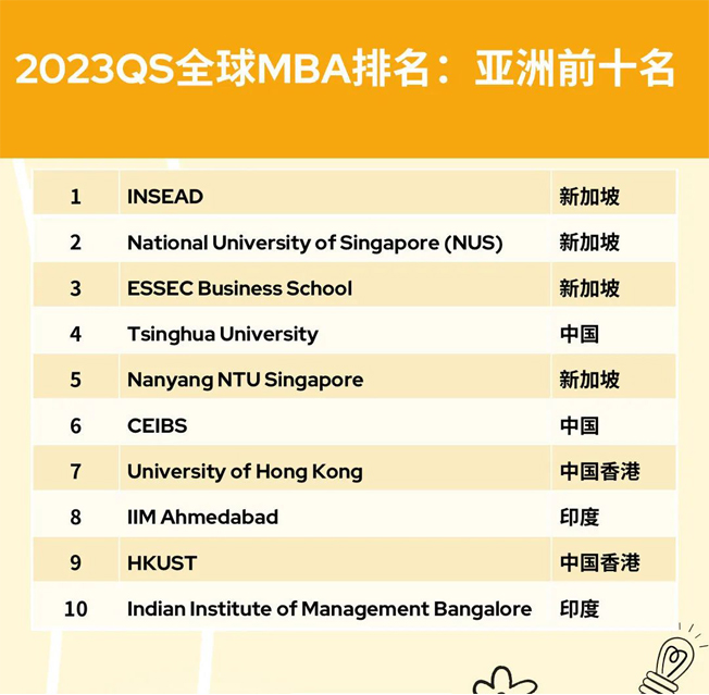 而在亚太地区,新加坡共有3个MBA项目跻身世界前30名,包括欧洲工商管理学院(INSEAD)(第9名)、新加坡国立大学(第26名)和ESSEC商学院(第28名),这三所学校也同时包揽了亚洲MBA TOP10的前三名。