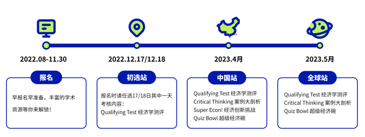 中国站比赛时间:2023年3月,考核内容是Qualifying Test经济学测评、Critical Thinking案例大剖析、Super Econ、经济创新挑战、Quiz Bowl经济超级碗四项。