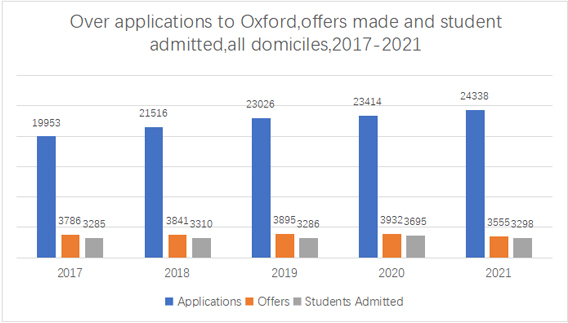 对比2017-2021年官方给出的数据,近五年中,牛津大学的申请人数增长了约22%。而今年,2021年总申请人数达24,338人,发放offer3,555封,最终录取人数为3,298人,录取率约14.6%。