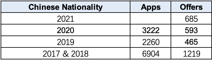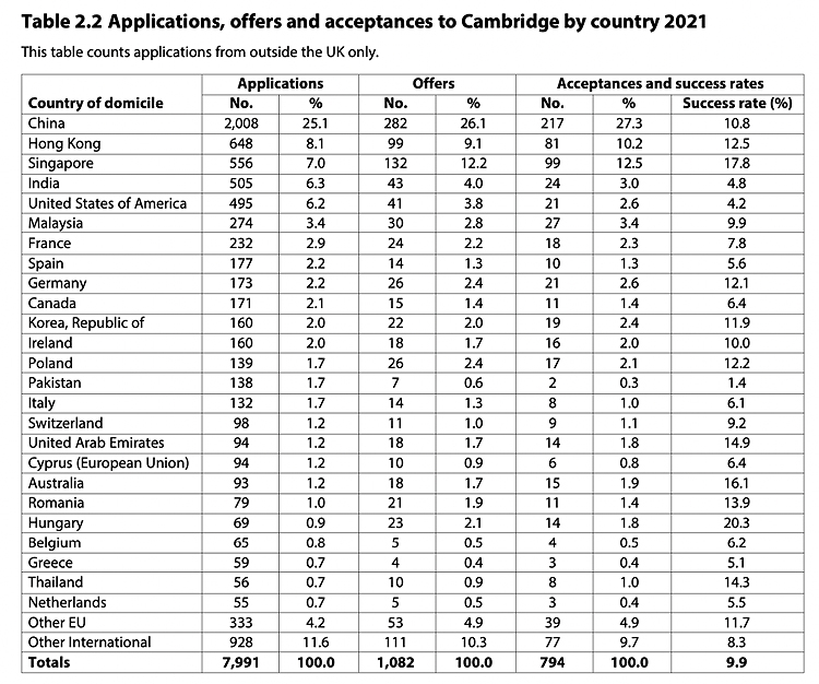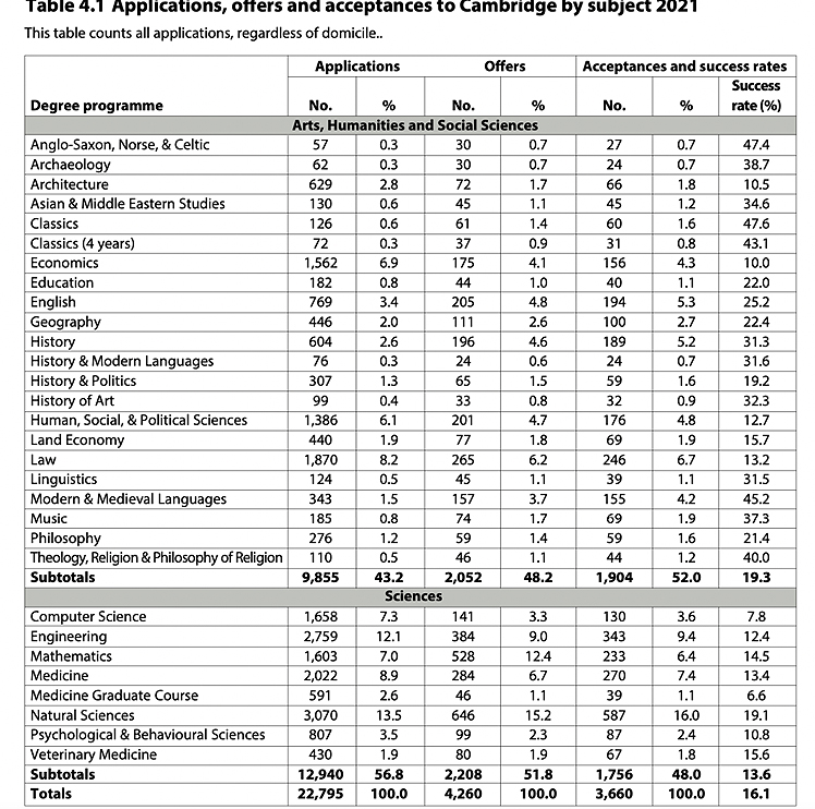 与2020年入学季相比,申请剑桥大学的人数增长了11.6%,但发放offer数量下降了9.6%,并且最终录取人数下降了8.4%。