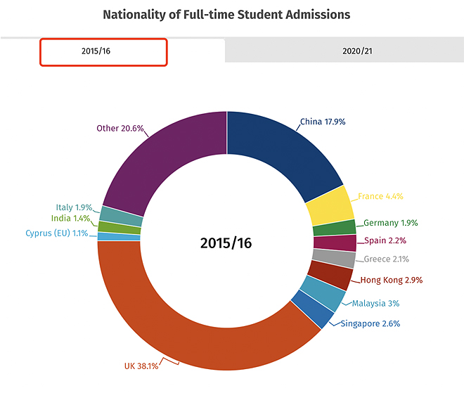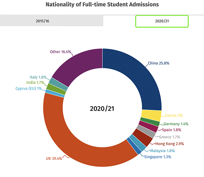 根据2015-16 和 2020-21 学年针对所有全日制新招生(本科和研究生)的国籍统计。2015-16学年来自英国以外的学生比例为62%,2020-21学年为61%。2015-16 和 2020-21 年最大的非英国国籍是中国(2015-16 年为 18%,2020-21 年为 26%)。
