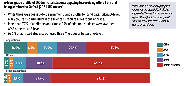 从牛津大学申请者的成绩来看,录取者A-Level的成绩达到3A*的学生占比近70%;超过77%的申请者和近95% 的录取学生在A-Level中获得A*AA或更好的成绩;68.1%的被录取学生在A-Level中取得了三个A*或更高的成绩。