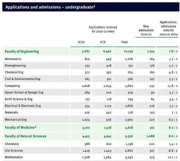 根据帝国理工学院最新的录取数据显示,2020-21学年帝国理工本科总申请人数26133人,比上一年增长了2600多人,平均8.2录1,和上一个申请季相比录取率略有上涨。这和2020年疫情出现大考取消采用TAG成绩后更多过线学生有关