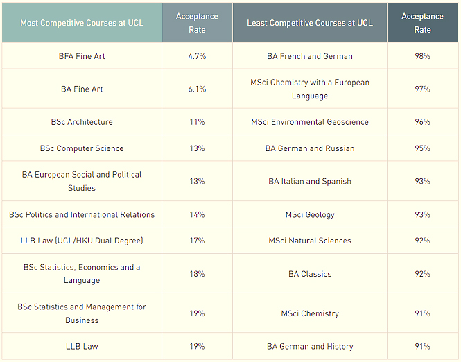 在UCL,本科最热门的专业依次是:法律、经济学、医学、建筑学、心理学、计算机科学、政治和国际关系、管理科学、以及生物医药。下图是UCL本科专业录取率。