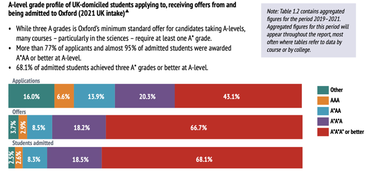 从牛津大学申请者的成绩来看,录取者A-Level的成绩达到3A*的学生占比近70%;超过77%的申请者和近95%的录取学生在A-Level中获得A*AA或更好的成绩;68.1%的被录取学生在A-Level中取得了三个A*或更高的成绩。