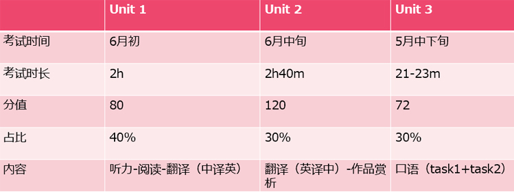 . U1考试时长为2小时,总分80分,占总成绩的40%,试卷考查三个方面包括听力、阅读和翻译(中译英);