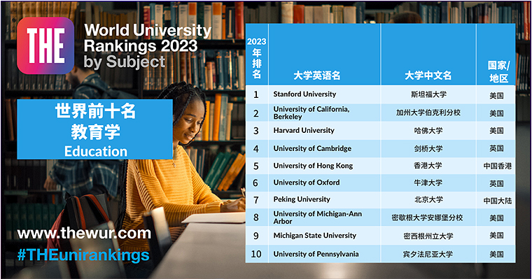 教育学排名中国院校表现亮眼,香港大学位列第五名,北京大学位列第七名,其他学校均为六所美国学校,以及两所英国学校。美国密歇根州立大学(Michigan State University)进入前10名,从第12名上升至第9名。