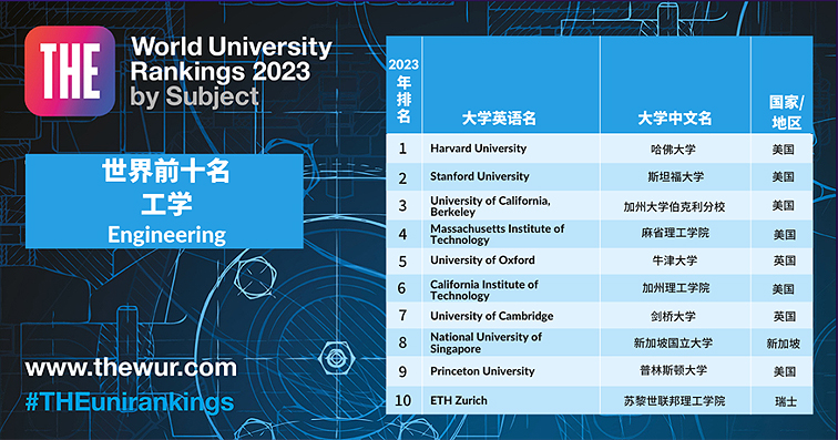 工学方面基本被美国和英国主导。哈佛大学、斯坦福大学、加州大学伯克利分校、麻省理工学院这四所美国学校为前四。