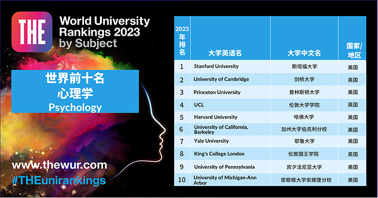 心理学前十全部是美英院校,英国的伦敦国王学院进入前10名,从第12名上升至第8名。