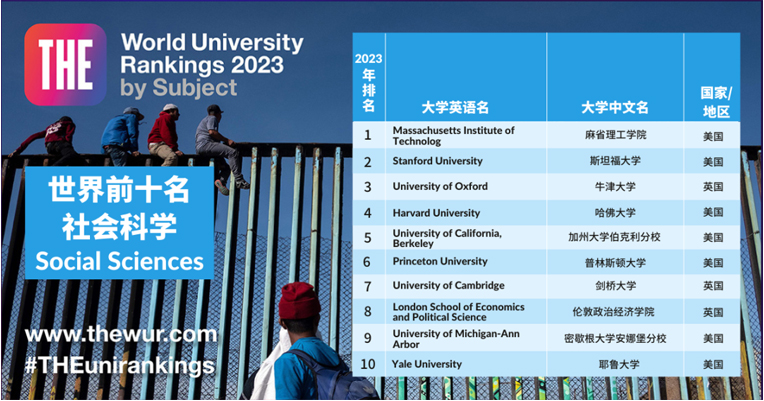 社会科学前十名也依旧是美英两国院校。美国耶鲁大学(Yale University)再次跻身前十,从第11名上升至第10名。