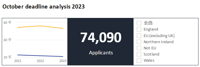 UCAS数据显示,截至2022年10月15日共有74090人成功提交了申请。总申请人数较前一年(77810人)减少了3720人(近5%)。