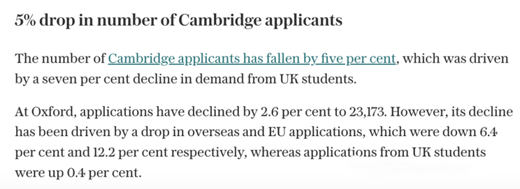 据英国电讯报报道,今年剑桥的申请人数下降了5%,牛津的申请人数下降了2.6%。其下降的原因是海外和欧盟申请人数的下降,分别下降了6.4%和12.2%,而英国学生的申请上升了0.4%。