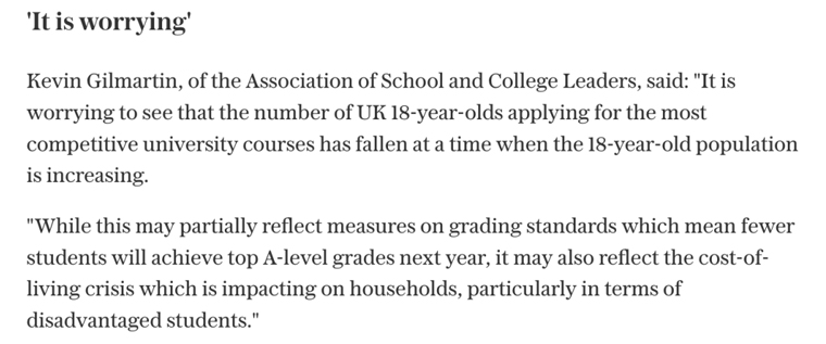Association of School and College的Kevin Gilmartin表示说:“可能与A-Level评估方式改变后的成绩下降导致,但同时,这也反应了生活成本上升带来的影响,尤其对处于经济弱势的学生。”