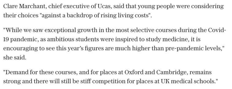 UCAS首席执行官Marchant则说:“当生活成本在上升时,年轻人需要考虑他们的选择,虽然虽然申请人数下降了,但牛剑和英国医学院的申请竞争依然会非常激烈。”