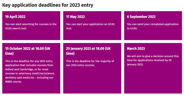 2022年10月15日:牛津、剑桥所有课程申请截止日期,同时也是兽医/科学、牙科和医学的大多数课程,包括帝国理工的MBBS课程申请截止日期。