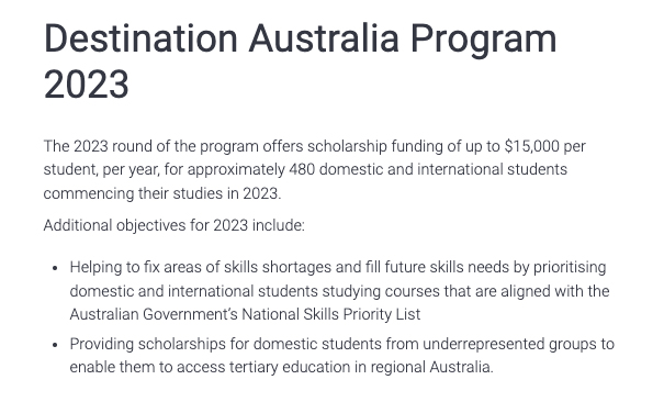 日前,澳洲联邦教育部宣布,符合条件的高等教育机构可以申请资金,通过“Destination Australia”计划为 2023年在澳洲偏远地区院校学习和生活的学生提供多达480个新奖学金。教育部助理部长Anthony Chisholm表示,该计划将侧重于为澳洲国际教育部门赋能,并为学生提供更多机会就读于已确定的技能短缺领域。
