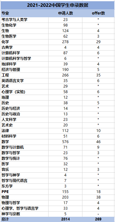 *出于保护个人隐私的原因,牛津大学没有公布数量小于3的申请人数和offer数量。