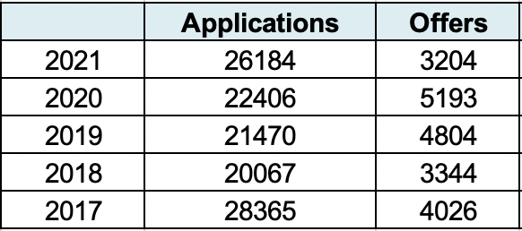 根据LSE伦敦政治经济学院录取数据显示,2021入学季,总申请人数仍然继续增长,达到26184人,发放offer 3204 封,最终录取1775人,录取率约12.2%。在近五年中,申请LSE 的人数增长了约 42.6%。