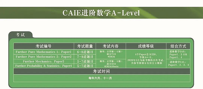 CAIE考试局的A-Level进阶数学分为4个笔试paper,分别考核FP1、FP2、进阶力学、进阶概率与统计等。