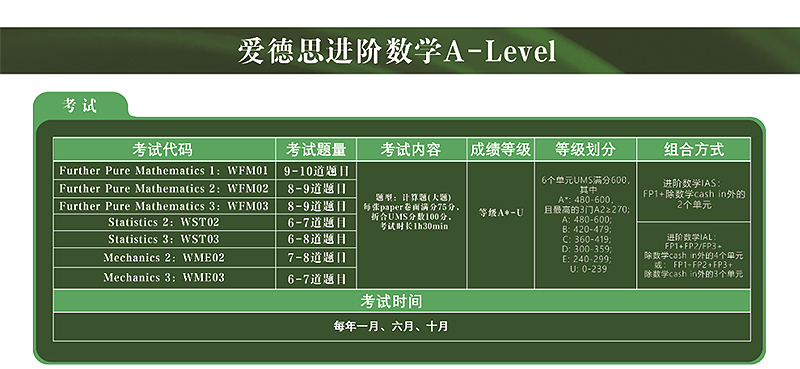 依据归属的考试局不同,A-Level进阶数学的考试次数也不一样,爱德思考试局的为一年三次,分别为1、6、10月,CAIE考试局的为6月和11月。