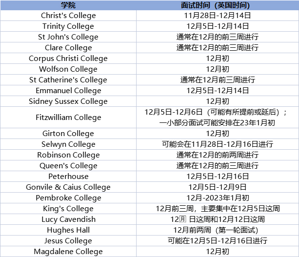 从上表可知,今年剑桥大学的面试最早的专业11月末就开始了,大部分专业安排在12月的前三周内进行,小部分面试可能安排在1月初。