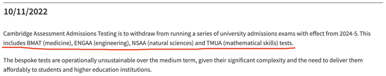 近日,Cambridge Assessment Admissions Testing在其官网发布了一则公告称:从2024-2025开始,CAAT将不再组织一系列大学入学笔试,包括医学方向的BMAT、工程方向的ENGAA、自然科学方向的NSAA以及数学方向TMUA等。