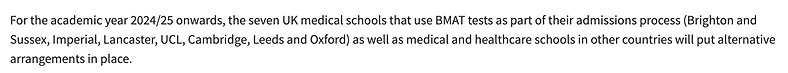 从2024-2025学年开始,英国七所大学的医学院(牛津、剑桥、帝国理工、UCL、利兹、兰卡斯特、Brighton & Sussex)以及其他国家和地区医学院将会另作安排(具体变化未知)。