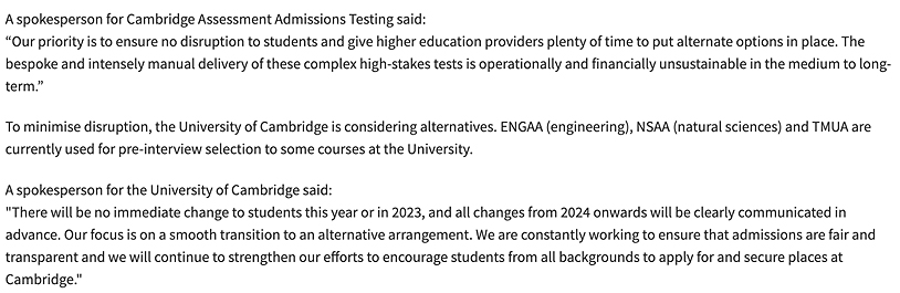 剑桥大学的发言人也表示:目前的重点是平稳过渡到其他方案。为了减少对未来申请者们的影响,剑桥大学也正在积极考虑其他方案,2024年之后的所有变化都将提前告知申请者。